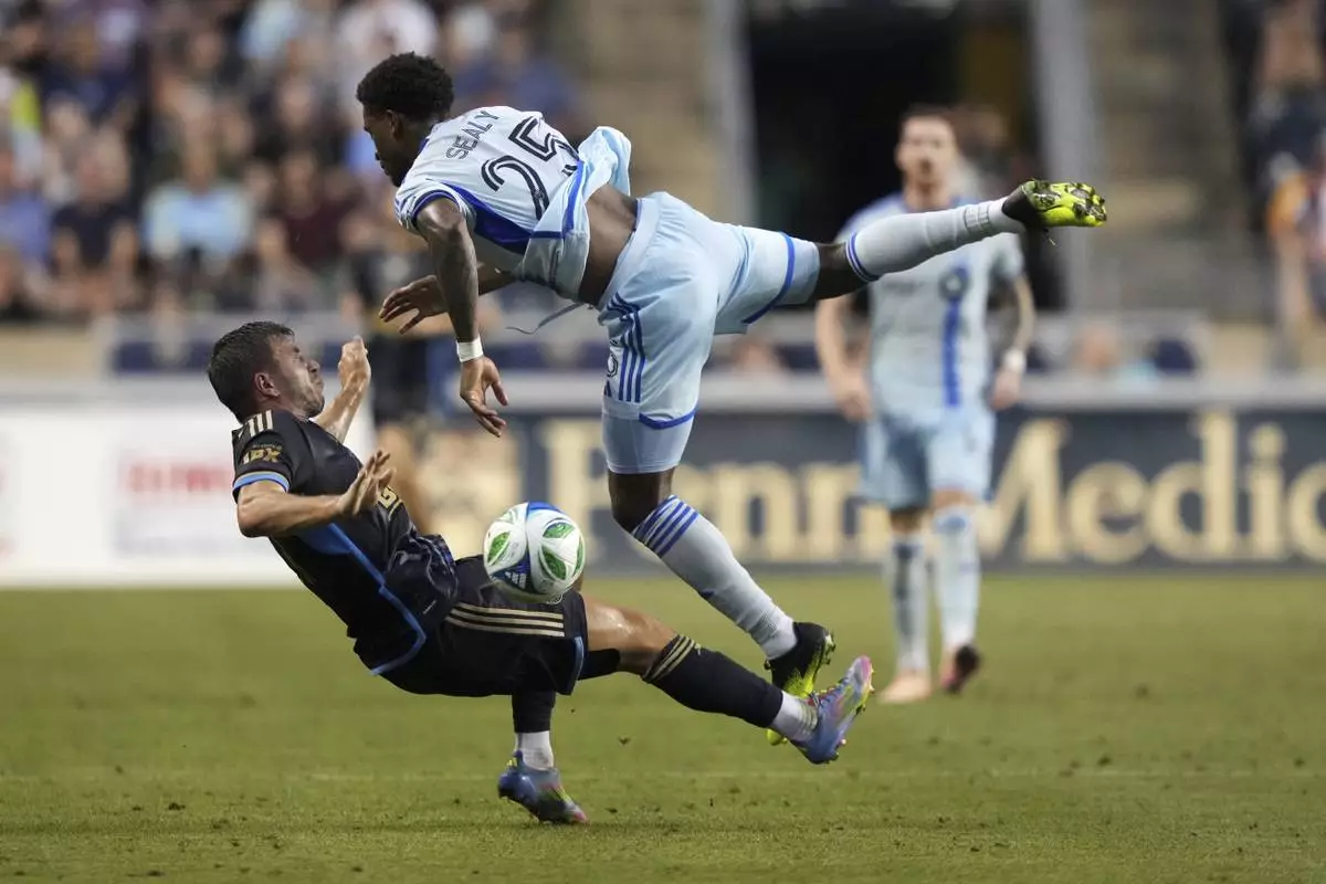 Philadelphia Union's Kai Wagner, left, and CF Montréal's Dante Sealy collide during the first half of an MLS soccer match, Wednesday, July 16, 2025, in Chester, Pa. (AP Photo/Matt Slocum)