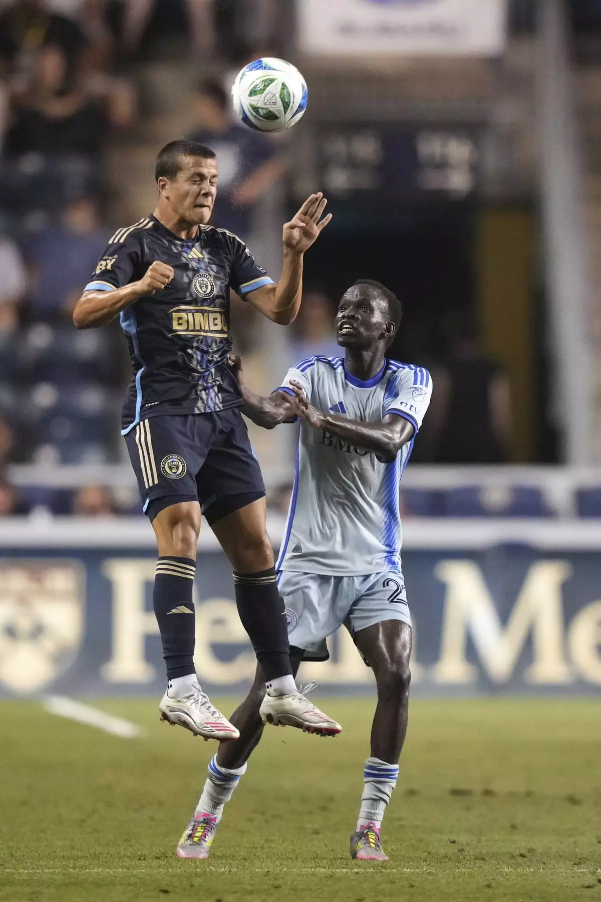 CORRECTS PLAYER'S NAME TO JOEL WATERMAN NOT TYRESE SPICER AND TEAM TO CF MONTREAL NOT TORONTO FC - Philadelphia Union's Bruno Damiani, left, and CF Montreal's Joel Waterman leap for the ball during the first half of an MLS soccer match, Wednesday, July 16, 2025, in Chester, Pa. (AP Photo/Matt Slocum)