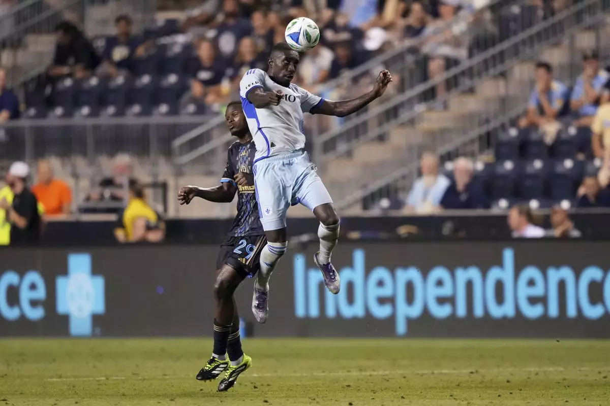 CF Montréal's Prince Osei Owusu, right, leaps for the ball past Philadelphia Union's Olwethu Makhanya during the second half of an MLS soccer match, Wednesday, July 16, 2025, in Chester, Pa. (AP Photo/Matt Slocum)