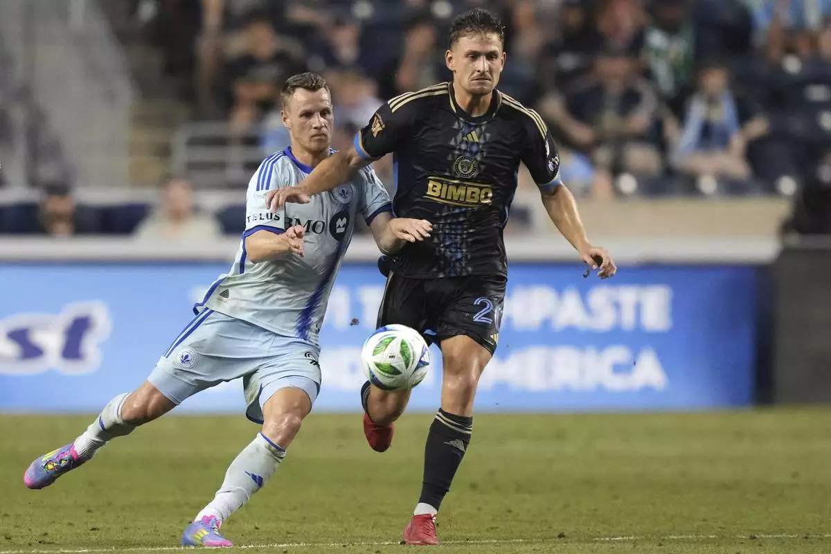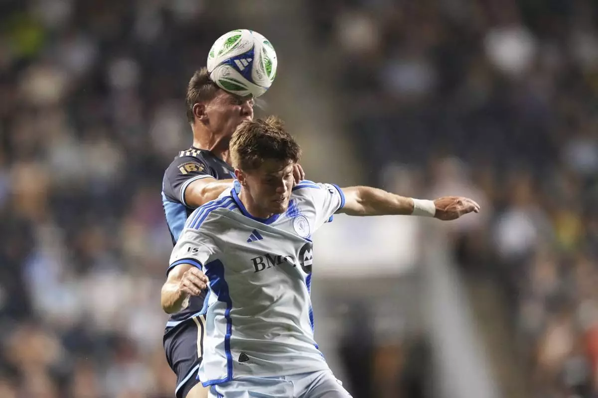 Philadelphia Union's Nathan Harriel, left, leaps for the ball past CF Montréal's Luca Petrasso during the first half of an MLS soccer match, Wednesday, July 16, 2025, in Chester, Pa. (AP Photo/Matt Slocum)