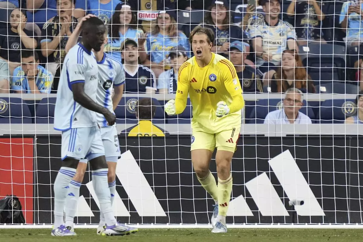 CF Montréal's Sebastian Breza reacts during the first half of an MLS soccer match against the Philadelphia Union, Wednesday, July 16, 2025, in Chester, Pa. (AP Photo/Matt Slocum)