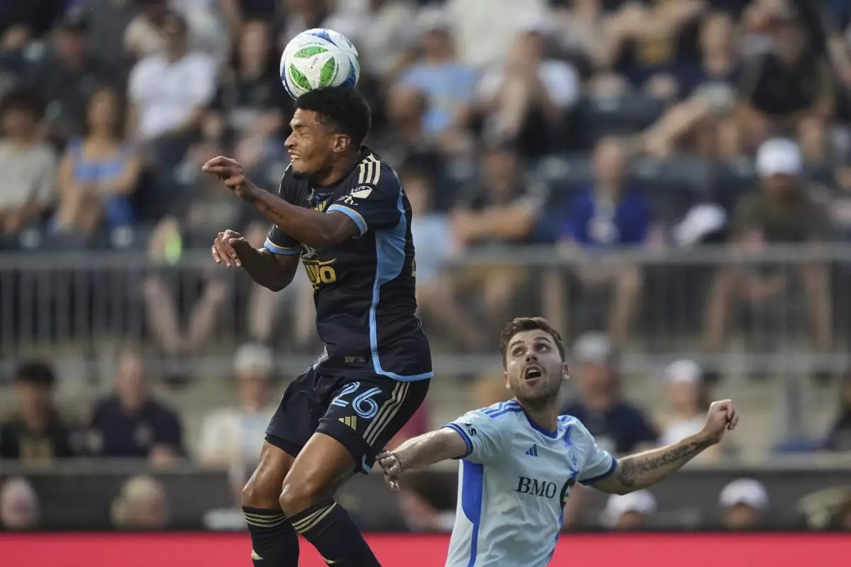 Philadelphia Union's Frankie Westfield, left, and CF Montréal's Tom Pearce leap for the ball during the second half of an MLS soccer match, Wednesday, July 16, 2025, in Chester, Pa. (AP Photo/Matt Slocum)