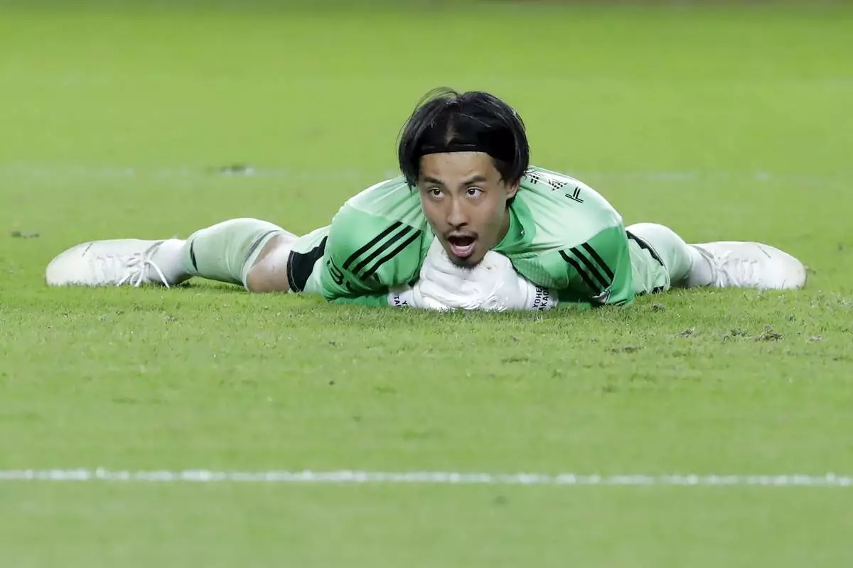 Vancouver Whitecaps goalkeeper Yohei Takaoka reacts after trapping the ball on a shot on goal by the Houston Dynamo during the second half of an MLS soccer match, Wednesday, July 16, 2025, in Houston. (AP Photo/Michael Wyke)