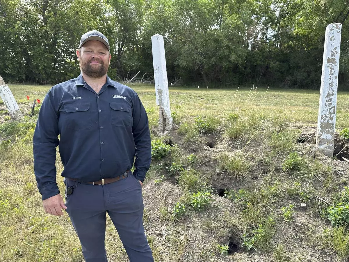 Joshua Herman, owner/operator of Herman Pest Control Services, poses for a photo on Monday, July 14, 2025, next to holes dug by Richardson's ground squirrels in Minot, N.D. (AP Photo/Jack Dura)
