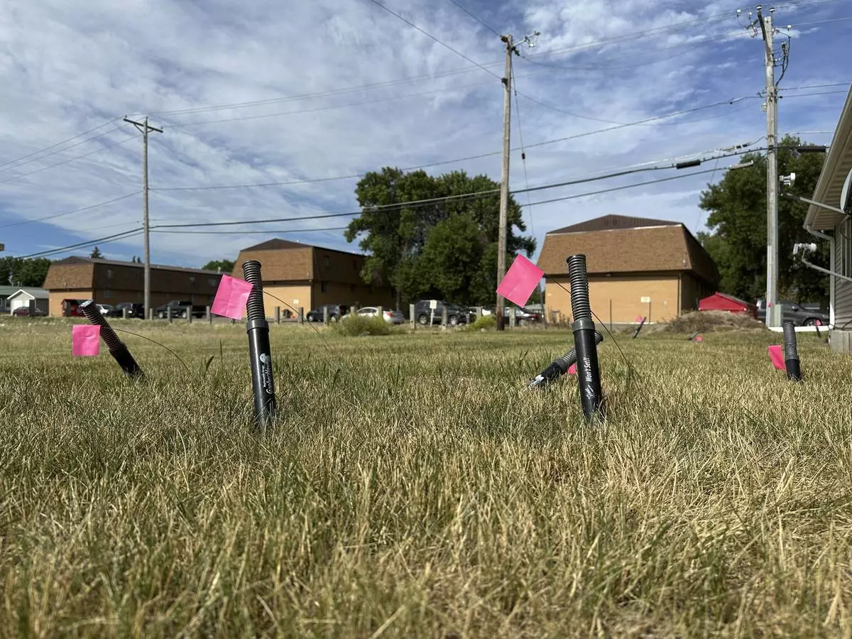 Snare traps set for Richardson's ground squirrels poke up from the ground along an apartment building on Monday, July 14, 2025, in Minot, N.D. (AP Photo/Jack Dura)