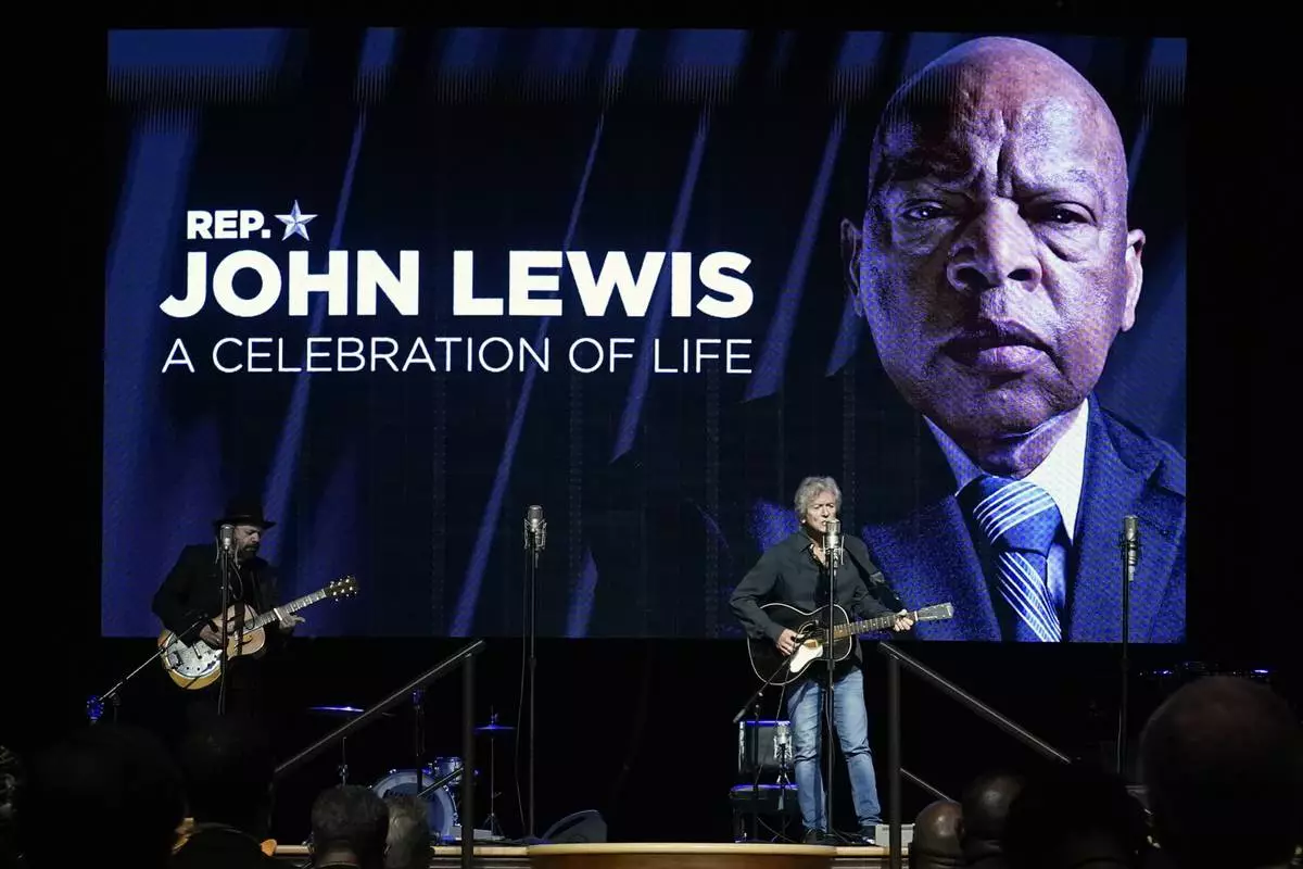 FILE - Rodney Crowell, right, performs in the Ryman Auditorium during a celebration of life marking the one-year anniversary of U.S. Rep. John Lewis's death, July 17, 2021, in Nashville, Tenn. (AP Photo/Mark Humphrey, file)
