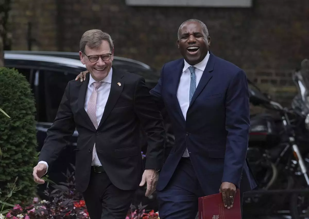 Germany's Minister for Foreign Affairs Johann Wadephul, left and Britain's Foreign Secretary David Lammy arrive in Downing Street, ahead of a meeting between Prime Minister Keir Starmer and German Chancellor Friedrich Merz, on the chancellor's first official visit to the UK, in London, Thursday July 17, 2025. (Lucy North/PA via AP)