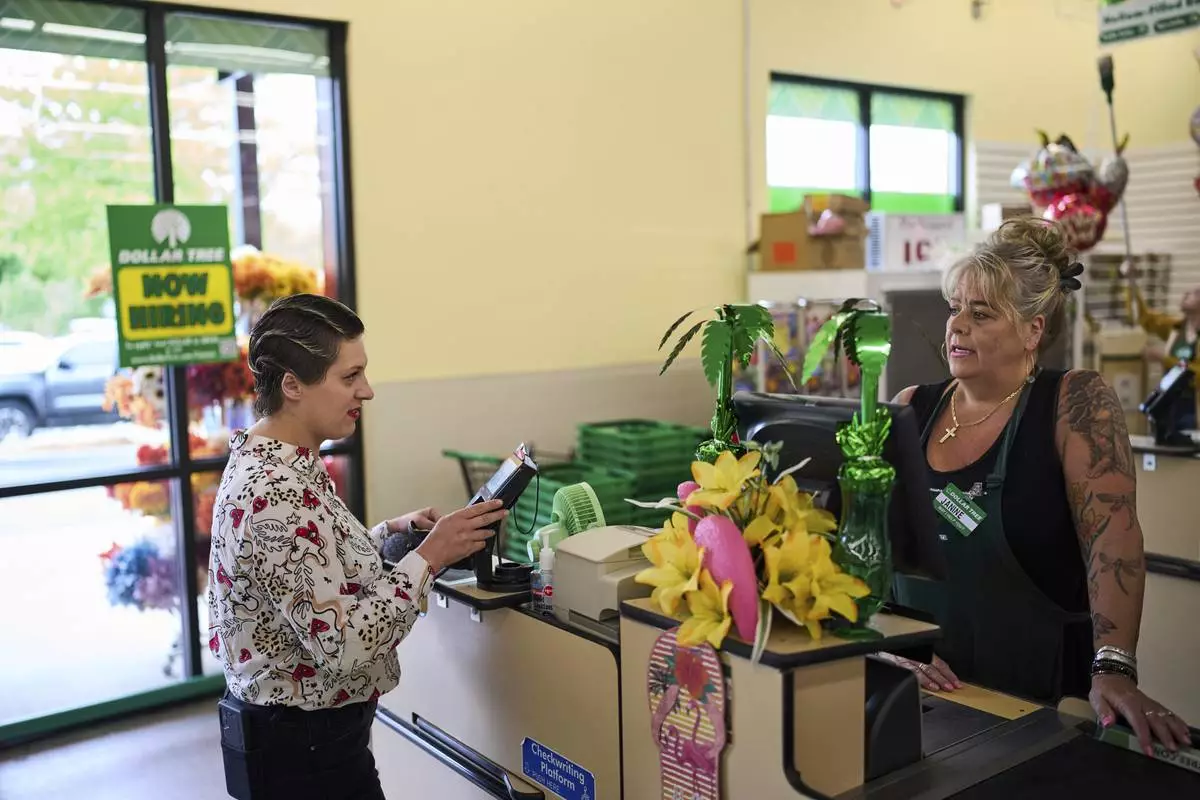 Havalah Hopkins, a single mother who lives in government-subsidized housing with her teenage son, talks with a cashier as she buys some balloons for her son's birthday at a Dollar Tree, Thursday, July 10, 2025, in Woodinville, Wash. (AP Photo/Lindsey Wasson)