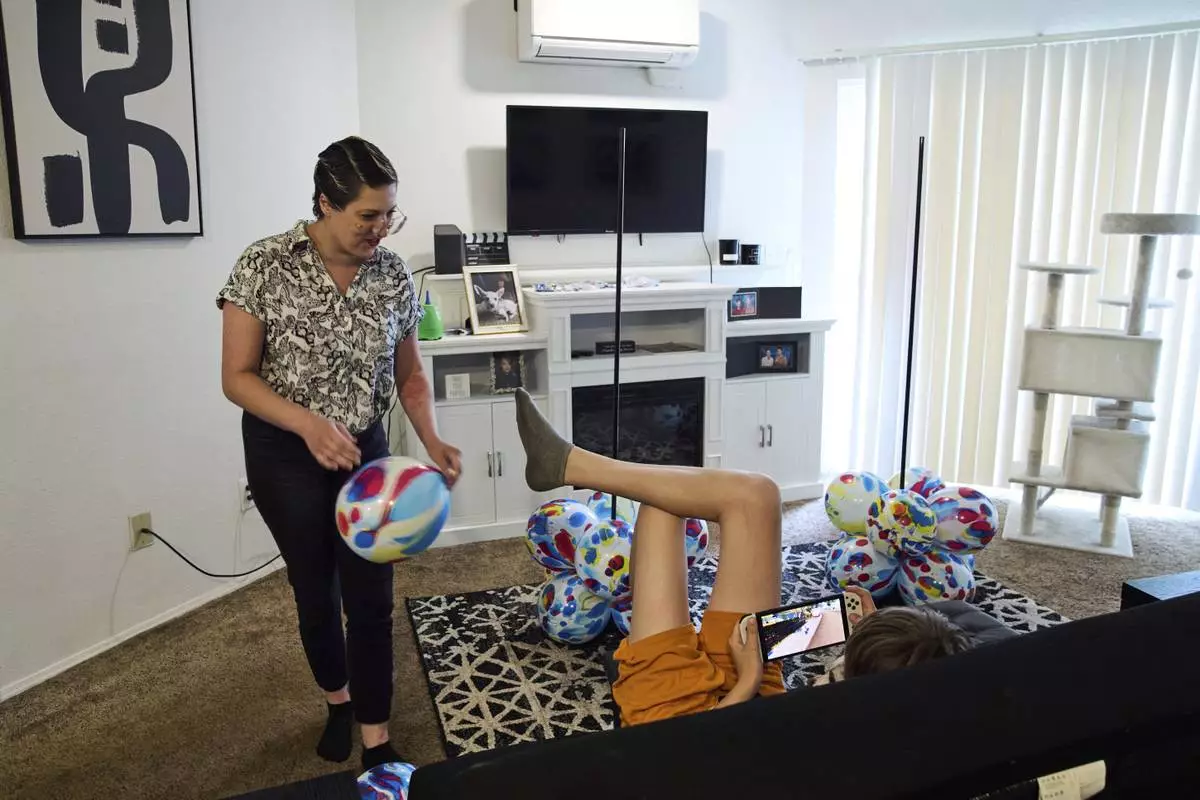 Havalah Hopkins, a single mother who lives in government-subsidized housing with her teenage son, talks with her son as she blows up balloon displays for his birthday, Thursday, July 10, 2025, at their apartment in Woodinville, Wash. (AP Photo/Lindsey Wasson)