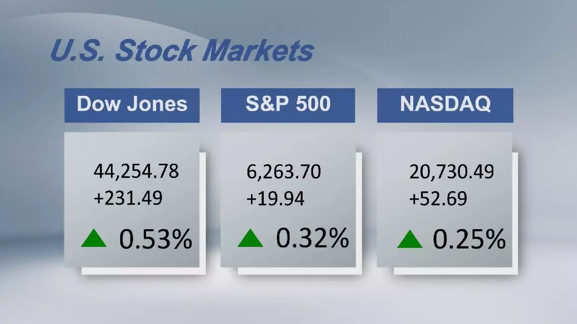 The Dow Jones Industrial Average rose 231.49 points, or 0.53 percent, to 44,254.78. The The Standard and Poor's 500 gained 19.94 points, or 0.32 percent, to 6,263.70, while the Nasdaq Composite added 52.69 points, or 0.25 percent, to close at 20,730.49.