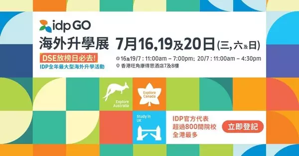 As the 2025 DSE results are released, IDP Education, a global leader in international education services, will host its flagship IDP GO Overseas Education Expo—the largest overseas education exhibition in Hong Kong. The event will take place across two floors at Cordis Hong Kong on July 16 (Wednesday), July 19 (Saturday), and July 20 (Sunday). It offers: