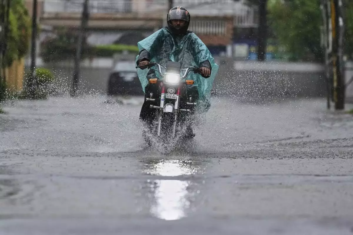 A motorcyclist rides through a flooded road during monsoon rainfall, in Rawalpindi, Pakistan, Thursday, July 17, 2025. (AP Photo/Anjum Naveed)