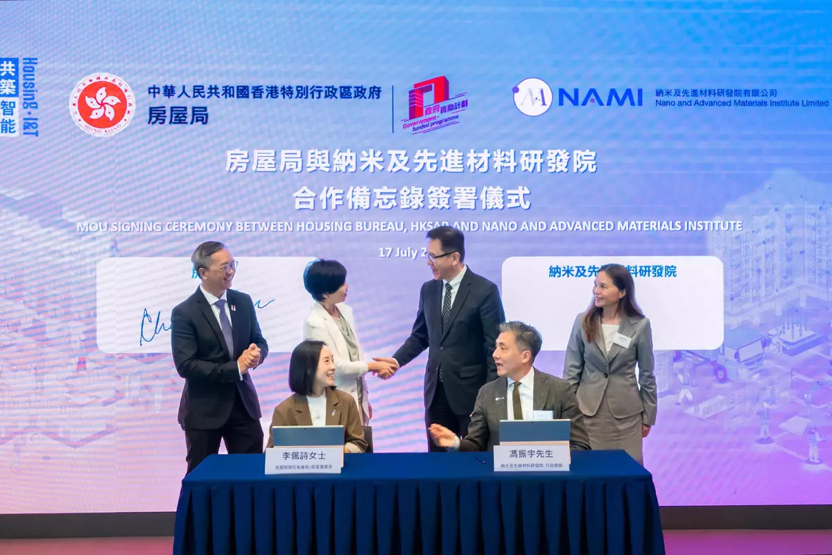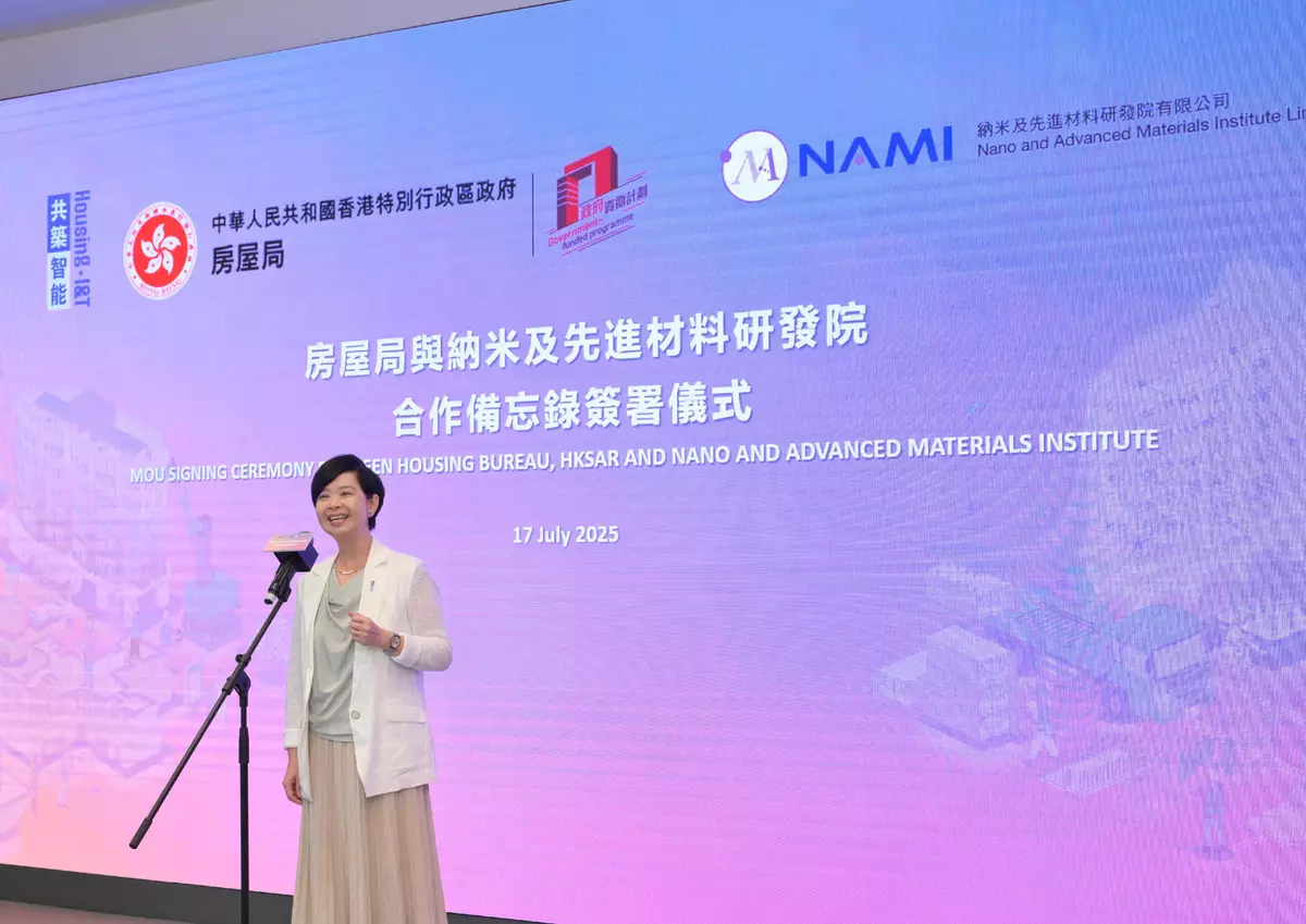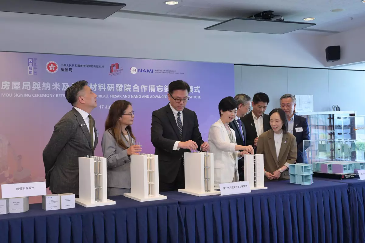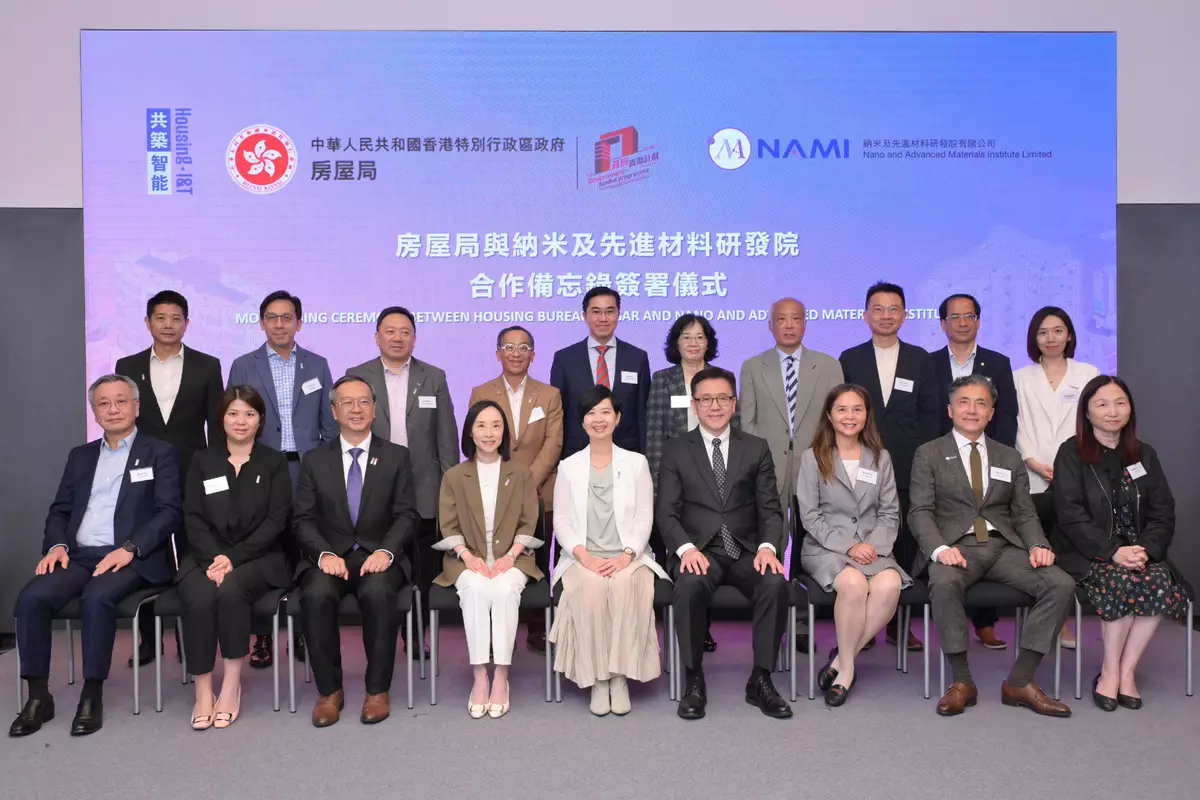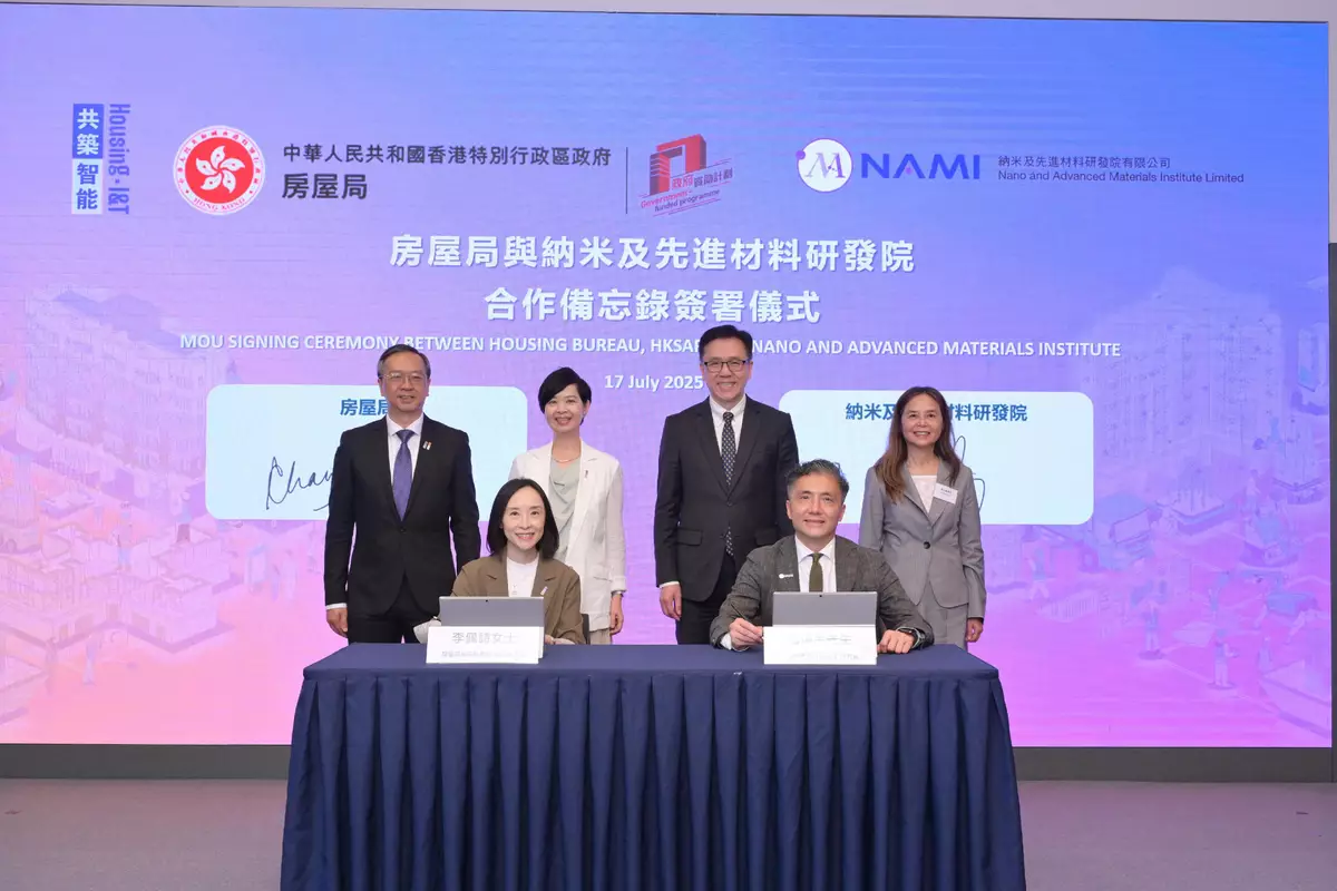 The Housing Bureau (HB) signed a Memorandum of Understanding (MOU) with the Nano and Advanced Materials Institute (NAMI) today (July 17) for the establishment of a strategic partnership to integrate the strengths of both parties and create a complete innovation ecosystem from research and development (R&D) to market application, building possibilities for the future with new ideas and technologies. This partnership will leverage the cutting-edge expertise of NAMI in advanced materials alongside the Hong Kong Housing Authority (HKHA)'s public housing practical verification platform. This will accelerate the validation and application of new building materials while creating a sustainable technology development model through patent protection and commercialisation mechanisms, supporting the development of Hong Kong into a regional intellectual property trading centre.