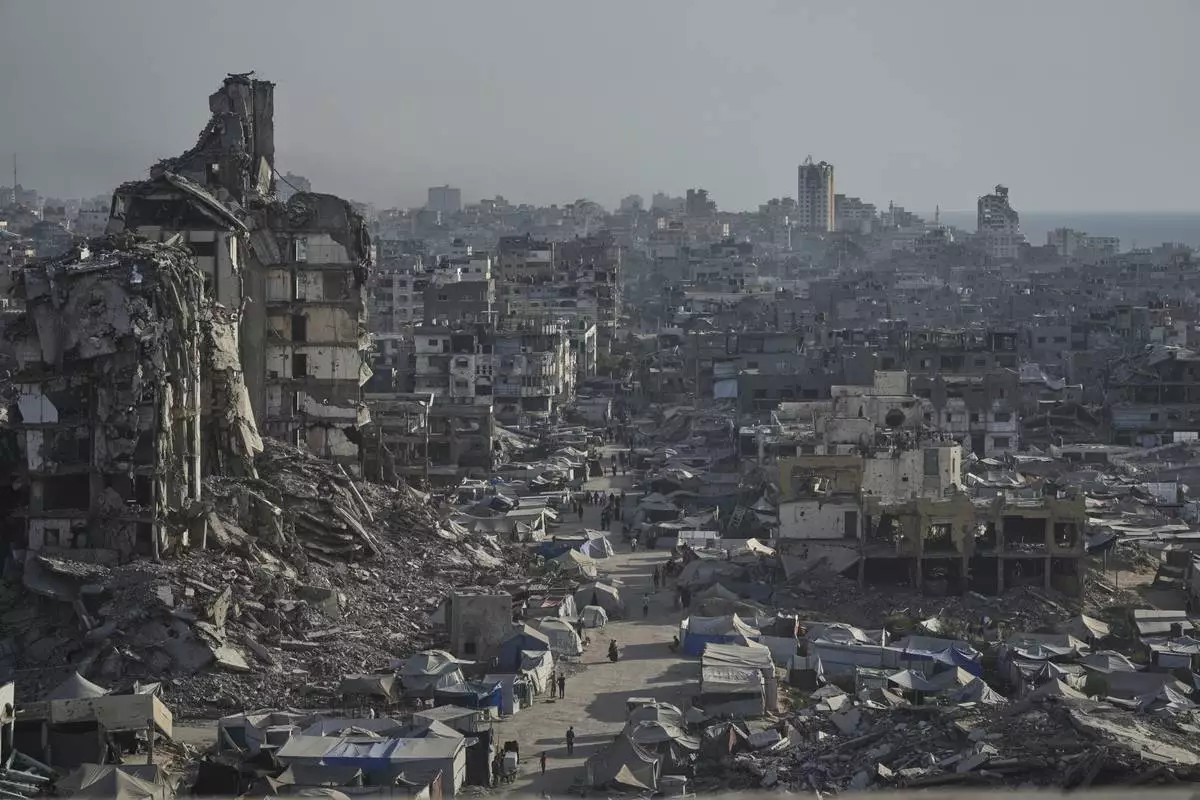 Tents sheltering displaced Palestinians are seen amid war-damaged infrastructure in Gaza City, Thursday, July 17, 2025. (AP Photo/Jehad Alshrafi)