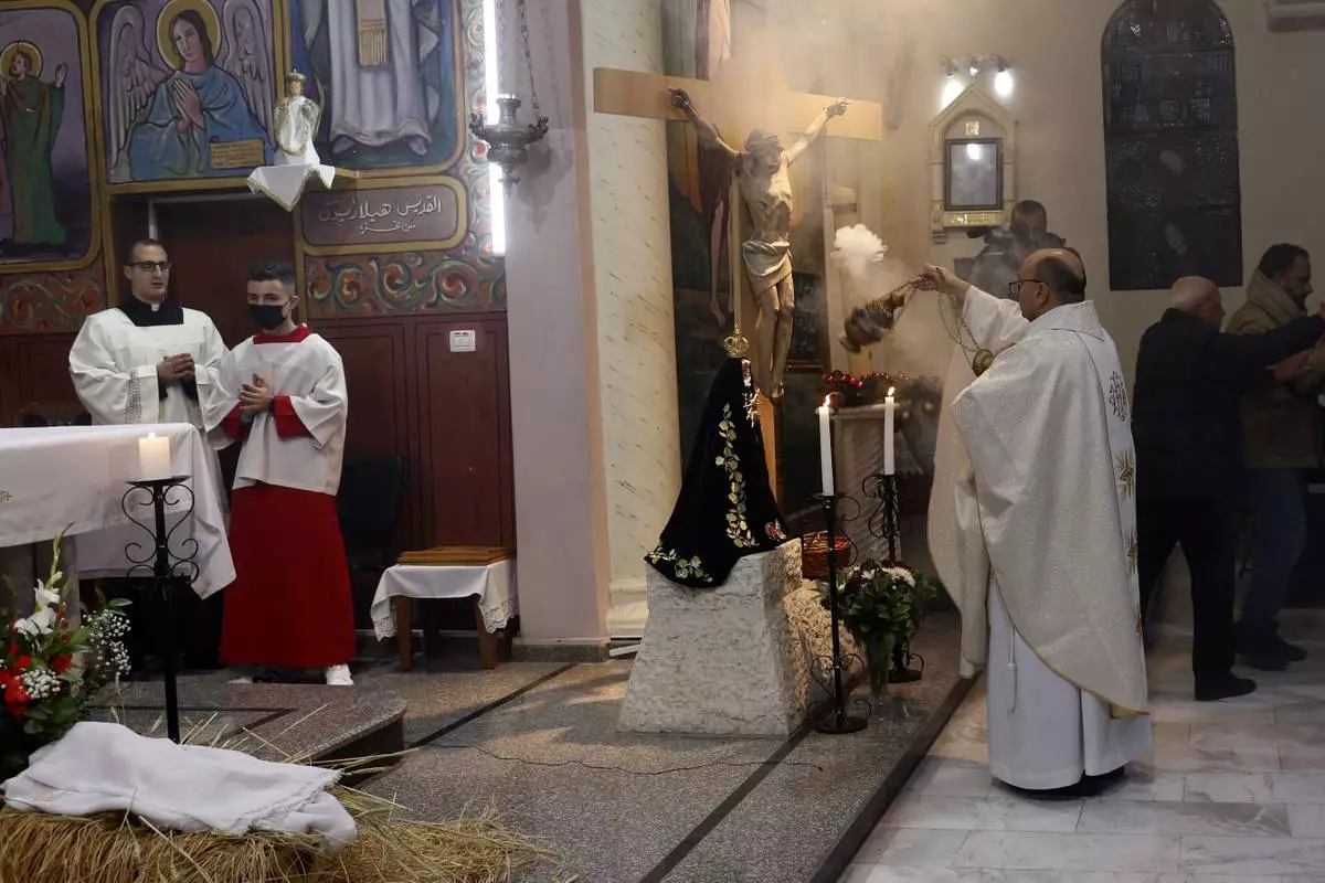 FILE -Fr. Gabriel Romanelli, Latin parish priest of Gaza Strip, left, prays during the midnight Christmas Eve mass at Deir Al Latin Holy Family Catholic Church in Gaza City, Dec. 24, 2021. (AP Photo/Adel Hana, File)