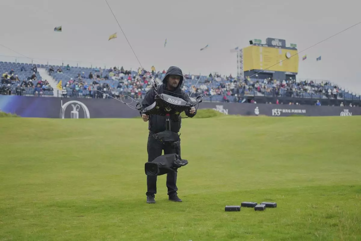 A technician changes the camera batteries on spidercam on the 18th green during the first round of the British Open golf championship at the Royal Portrush Golf Club, Northern Ireland, Thursday, July 17, 2025. (AP Photo/Jon Super)