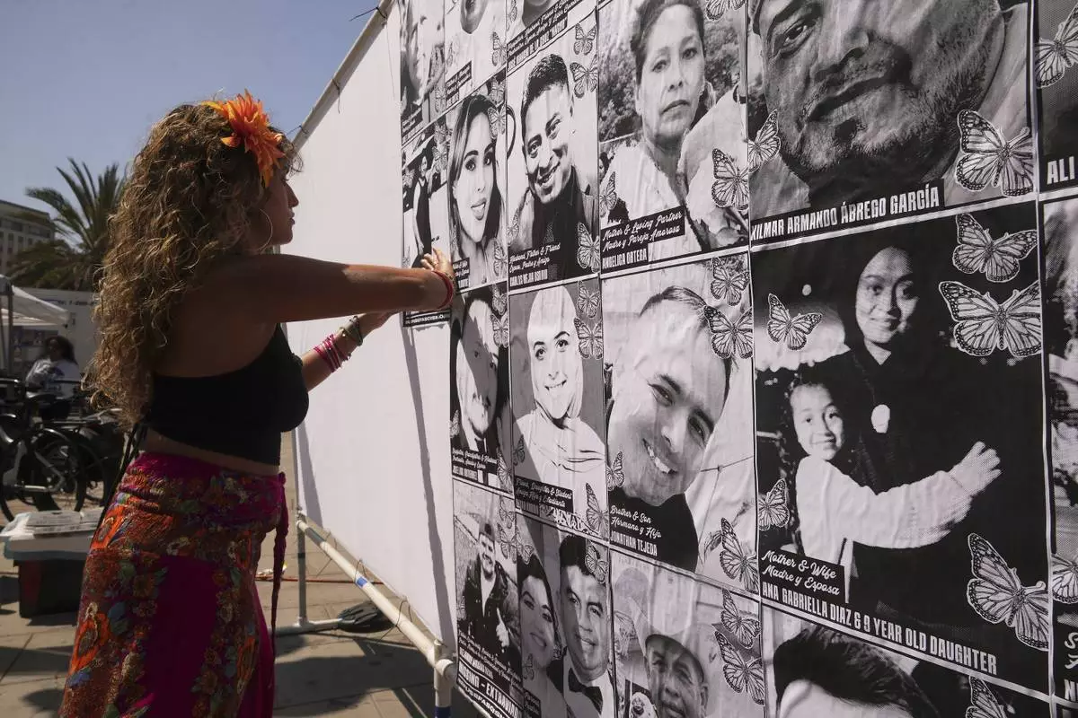 Special needs teacher Deja Nebula sets up an art installation displaying names and faces of people who have been detained, deported, or sent to offshore camps during ICE raids in Southern California, at Olvera Street Plaza in Los Angeles, on Thursday, July 3, 2025. (AP Photo/Damian Dovarganes)