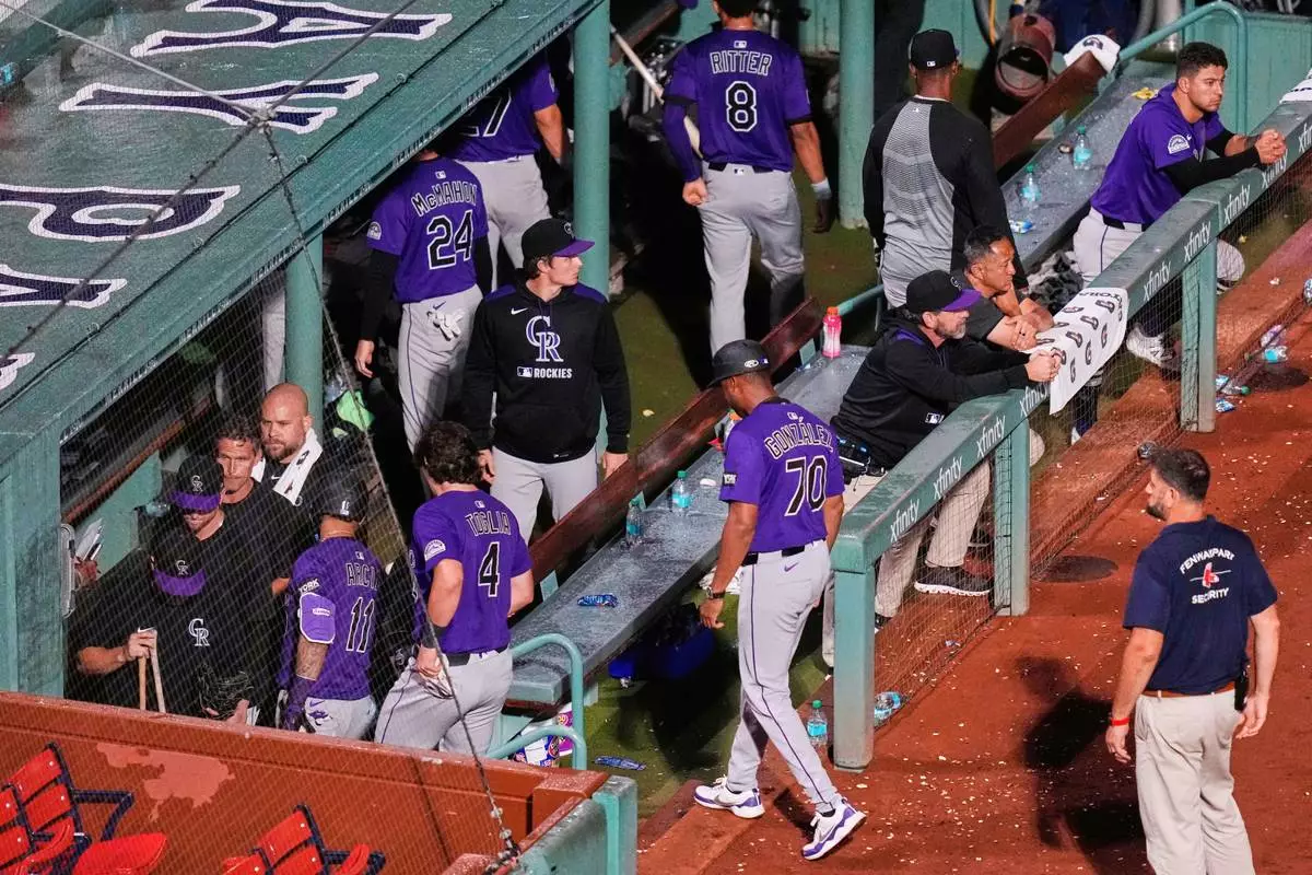 FILE - Colorado Rockies players leave the dugout after losing to the Boston Red Sox in a baseball game at Fenway Park, Wednesday, July 9, 2025, in Boston. (AP Photo/Charles Krupa, File)