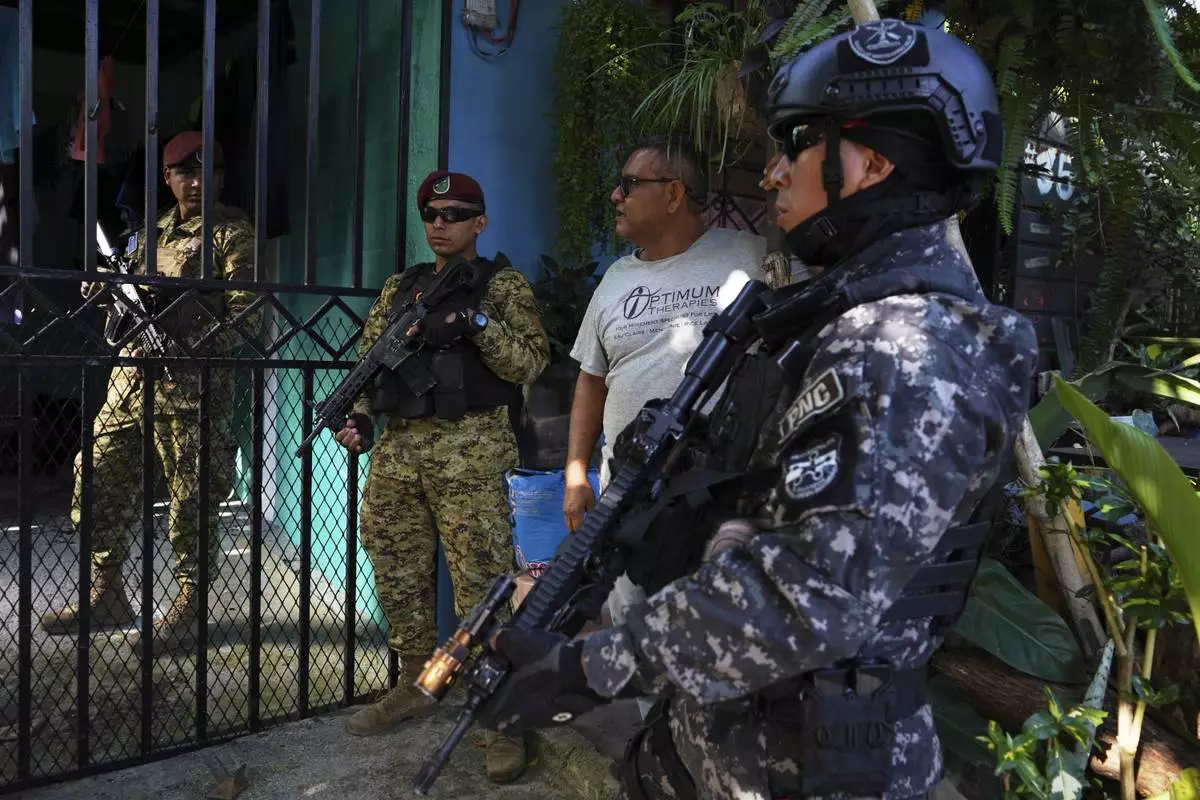 Police and soldiers stop to ask neighbors about an empty home as they patrol the San Bartolo neighborhood in El Salvador, Thursday, July 17, 2025. (AP Photo/Salvador Melendez)