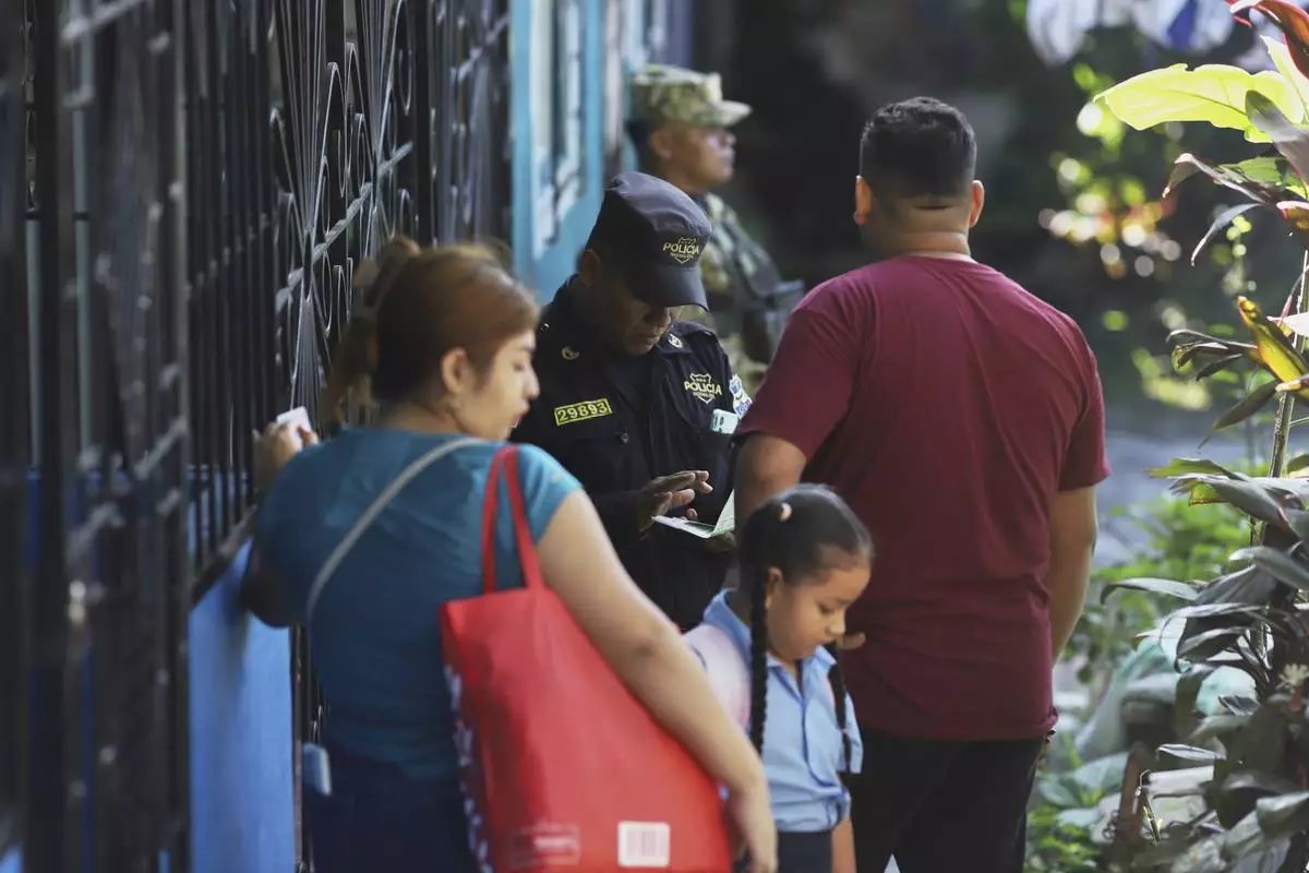 A police officer checks people's IDs in the San Bartolo neighborhood as police and soldiers patrol in El Salvador, Thursday, July 17, 2025. (AP Photo/Salvador Melendez)
