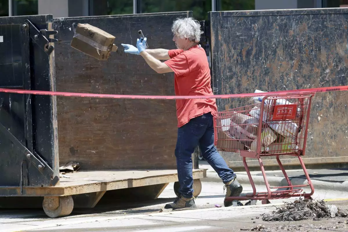 A worker tosses damaged merchandise into a large dumpster at the Trader Joe's supermarket in the Eastgate shopping center after it was flooded out during tropical storm Chantal, Monday, July 7, 2025, in Chapel Hill, N.C. (AP Photo/Chris Seward)