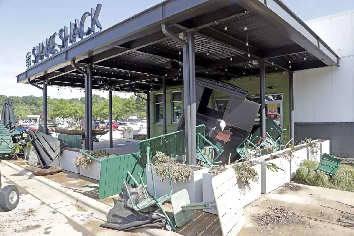 Chairs, umbrellas and a larger garbage container were among the debris washed up at the Shake Shack in the Eastgate Shopping Center after it was flooded during tropical storm Chantal, Monday, July 7, 2025, in Chapel Hill, N.C. (AP Photo/Chris Seward)