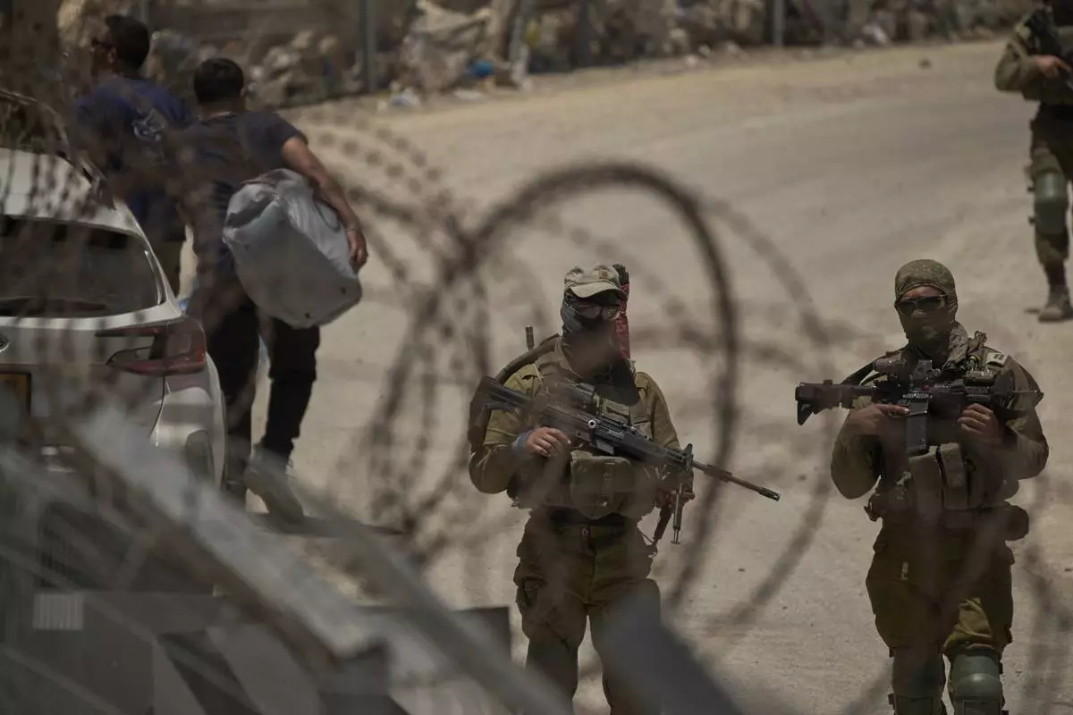 Israeli soldiers stand guard as Syrian Druze people cross back into Syria at the Israeli-Syrian border, in the Israeli-controlled Golan Heights town of Majdal Shams, Thursday, July 17, 2025. (AP Photo/Leo Correa)