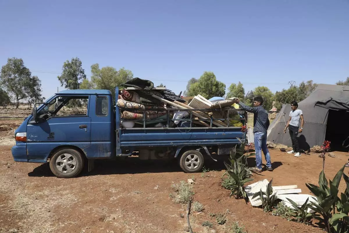 In this photo released by the Syrian official news agency SANA, Bedouin people pack their belongings onto a truck, as they flee their villages after Druze militias launched revenge attacks following days of clashes in Sweida city, southern Syria, Thursday, July 17, 2025. (SANA via AP)