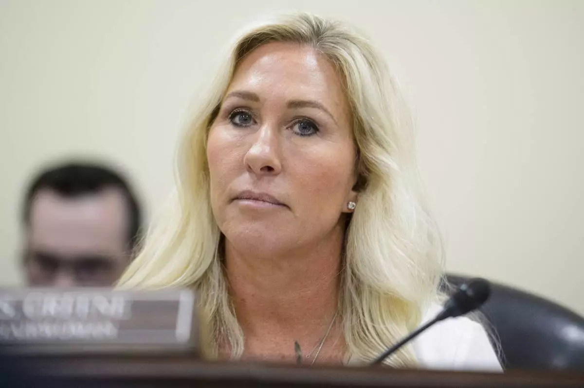 FILE - Rep. Marjorie Taylor-Greene, R-Ga., presides over a House Committee hearing on Capitol Hill, Feb. 12, 2025, in Washington. (AP Photo/Rod Lamkey, Jr., File)