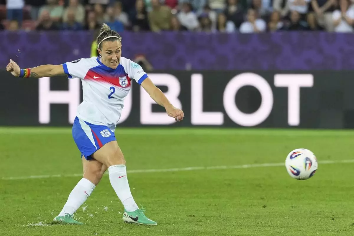 England's Lucy Bronze scores a penalty during a shootout of the Women's Euro 2025 quarterfinals soccer match between Sweden and England at Stadion Letzigrund in Zurich, Switzerland, Thursday, July 17, 2025. (AP Photo/Martin Meissner)