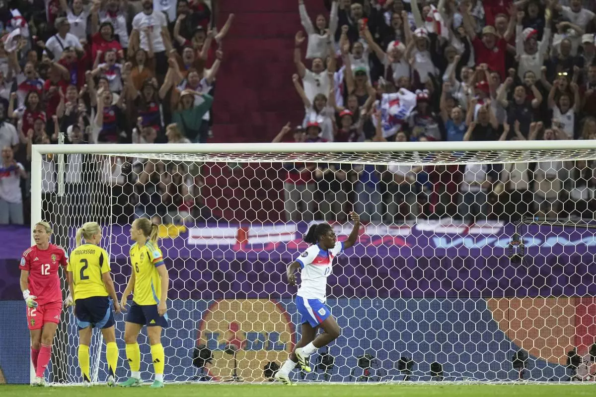 England's Michelle Agyemang celebrates after scoring her side's second goal during the Women's Euro 2025 quarterfinals soccer match between Sweden and England at Stadion Letzigrund in Zurich, Switzerland, Thursday, July 17, 2025. (AP Photo/Alessandra Tarantino)