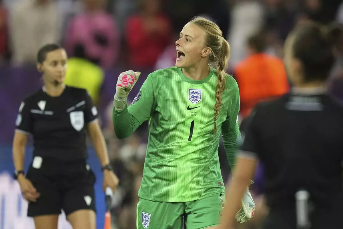 England goalkeeper Hannah Hampton celebrates during a penalty shootout at the end of the Women's Euro 2025 quarterfinals soccer match between Sweden and England at Stadion Letzigrund in Zurich, Switzerland, Thursday, July 17, 2025. (AP Photo/Alessandra Tarantino)