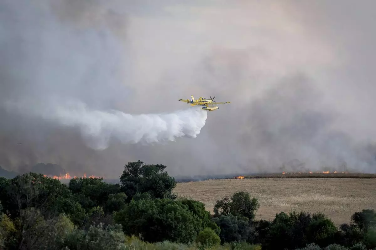 A firefighting plane drops water during efforts to extinguish a wildfire near Navalcarnero, on the outskirts of Madrid, Spain, Thursday, July 17, 2025. (A. Pérez Meca/Europa Press via AP)