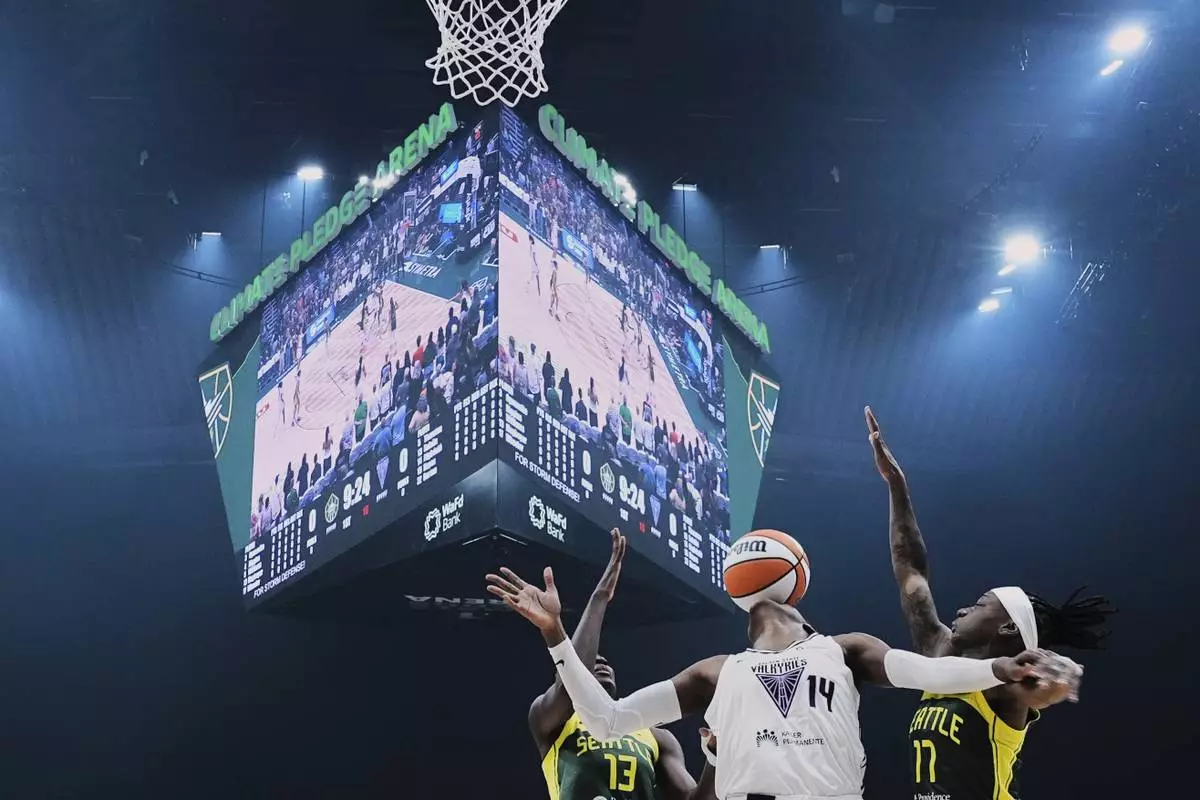 Golden State Valkyries center Temi Fagbenle (14) loses the ball against Seattle Storm forward Ezi Magbegor (13) and guard Erica Wheeler, right, during the first half of a WNBA basketball game Wednesday, July 16, 2025, in Seattle. (AP Photo/Lindsey Wasson)