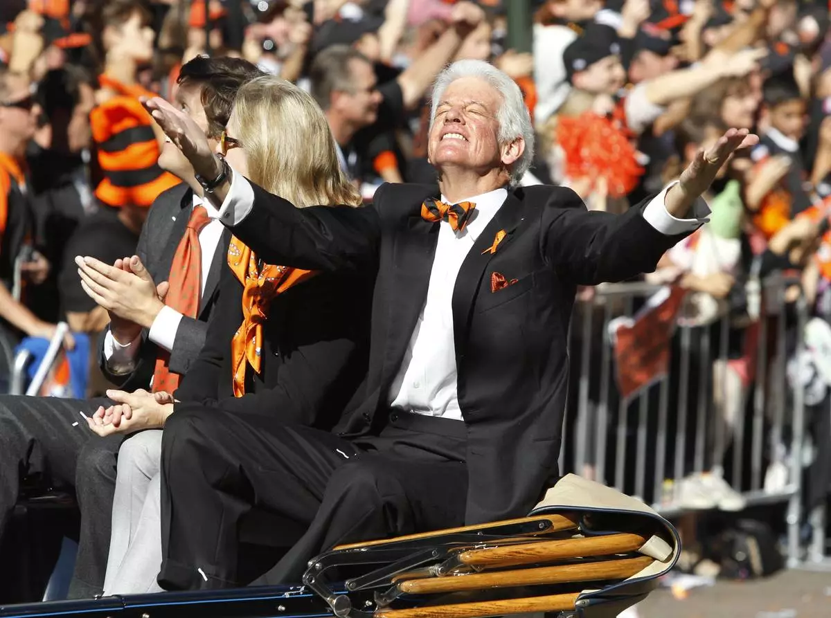 FILE - San Francisco Giants owner Bill Neukom celebrates while riding in a car during a baseball World Series parade in downtown San Francisco, Nov. 3, 2010. (AP Photo/Paul Sakuma, File)