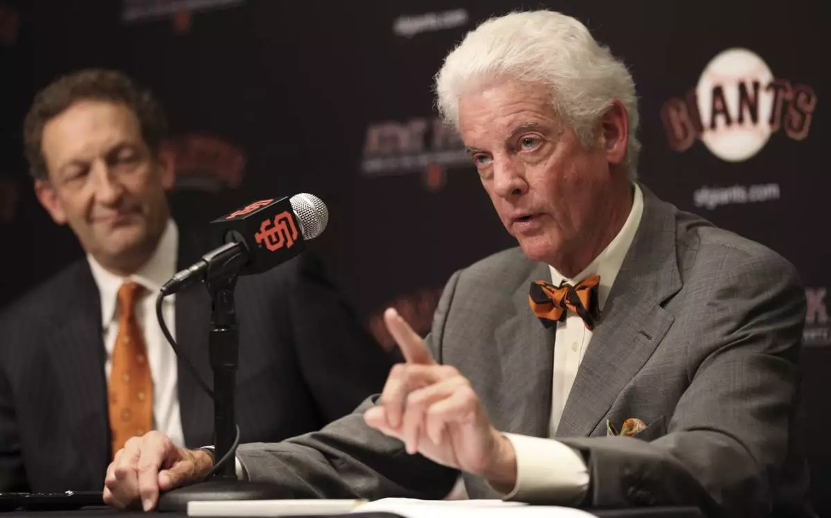 FILE - San Francisco Giants CEO Bill Neukom, right, gestures beside team president Larry Baer during a baseball news conference in San Francisco, Sept. 15, 2011. (AP Photo/Ben Margot, File)