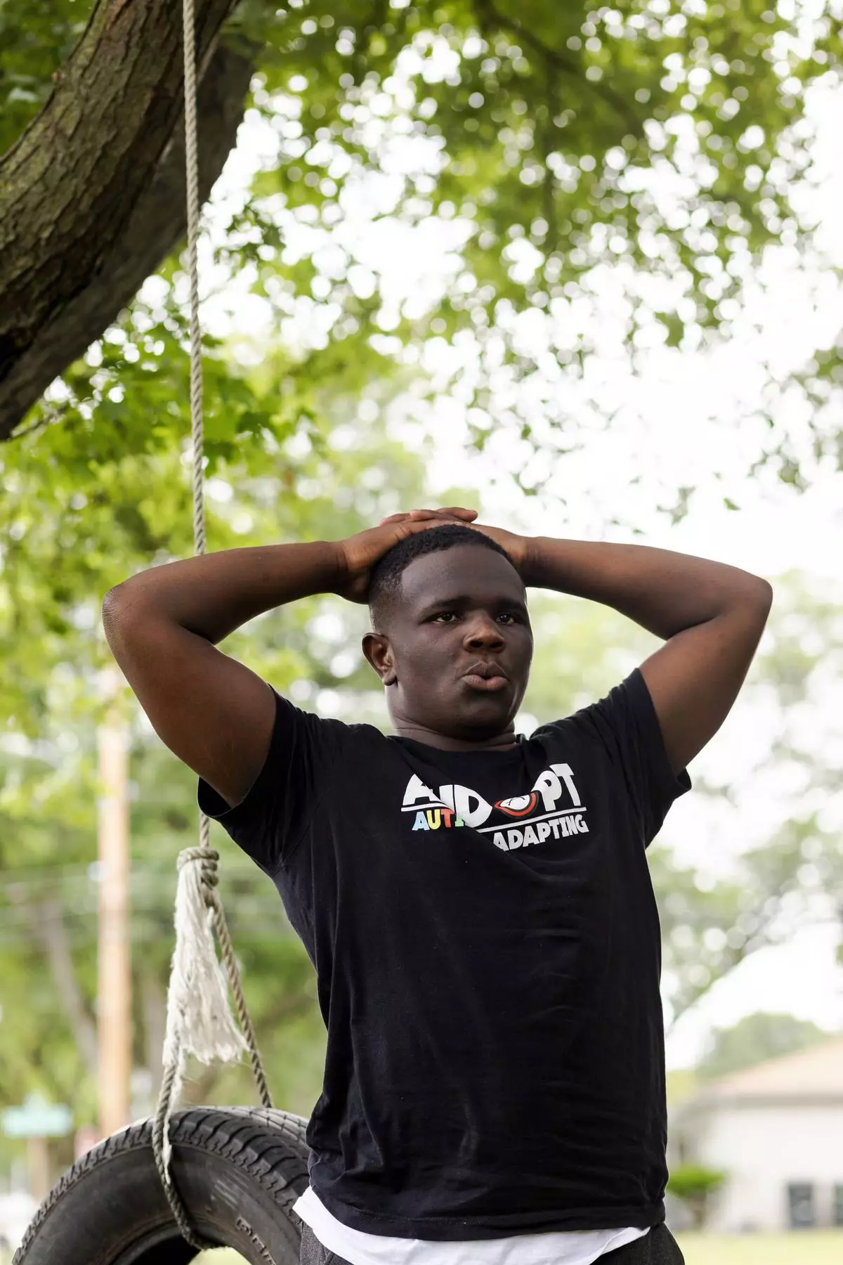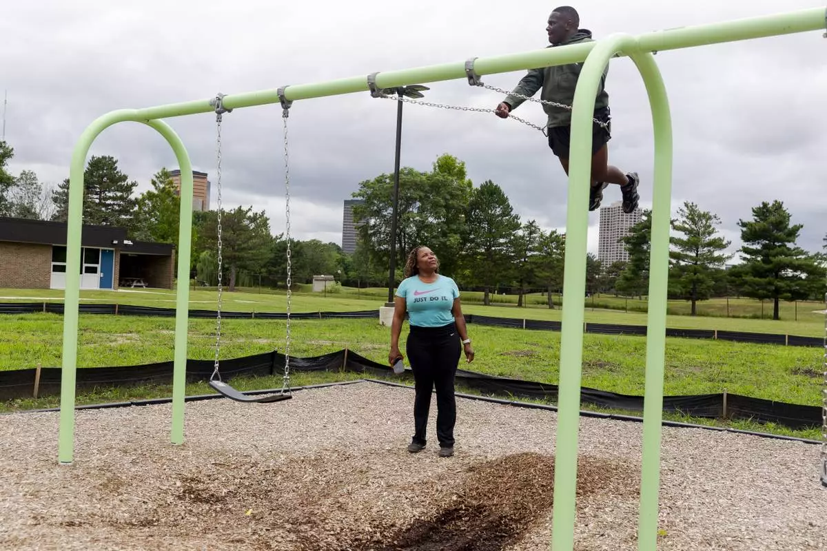 Adrienne Hazel watches her son Ricky as he plays on a swing on Thursday, July 17, 2025, in Southfield, Mich. (AP Photo/Sylvia Jarrus)