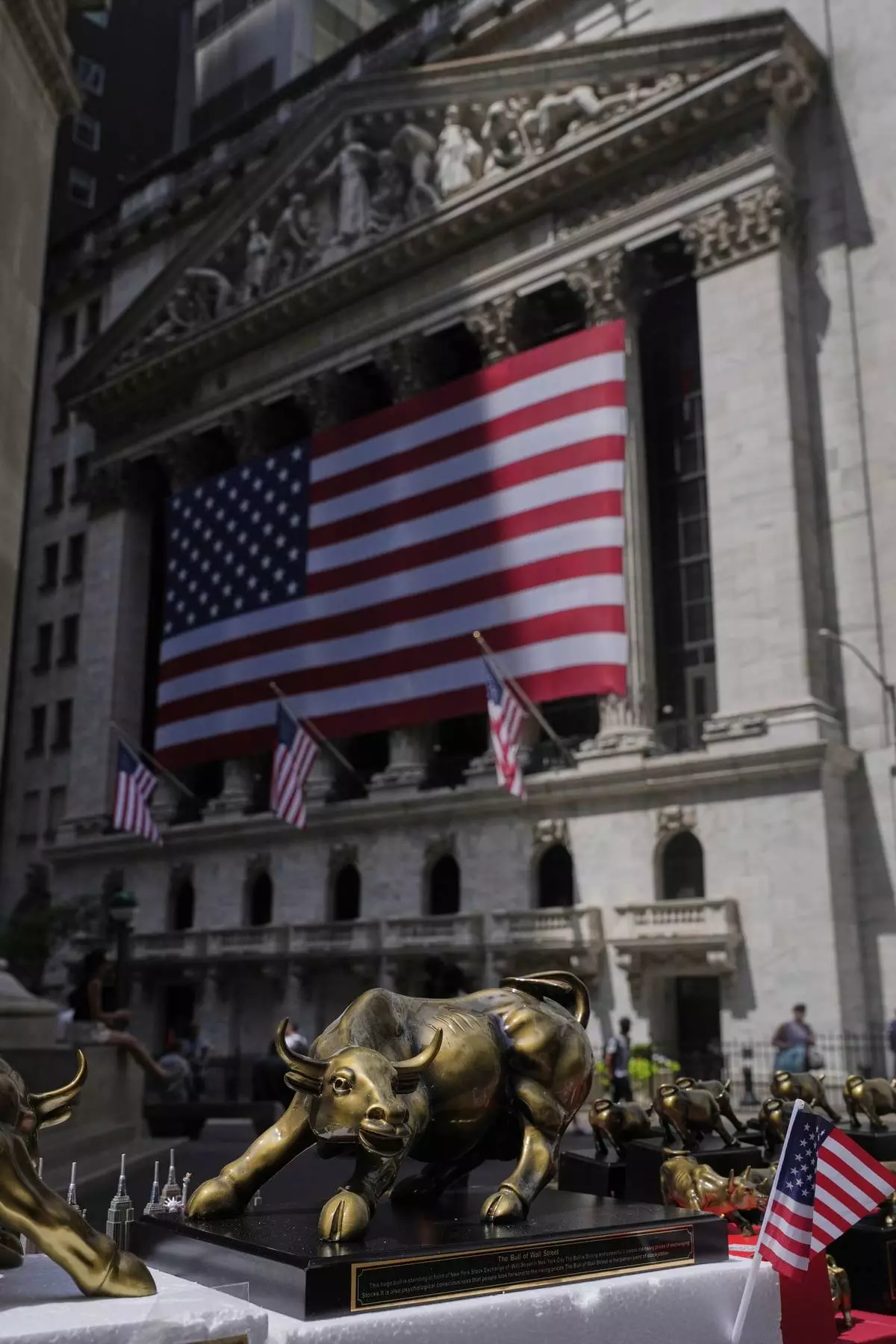 A vendor displays souvenirs on the street in front of the New York Stock Exchange in New York, Monday, July 14, 2025. (AP Photo/Seth Wenig)
