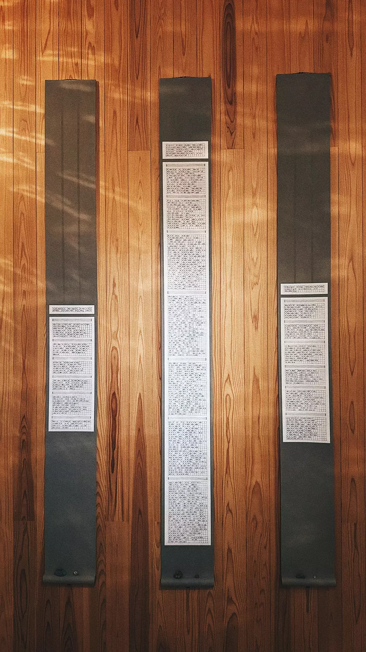 Cheung and Shum were deeply touched by the uniquely shaped water stones of the Shinano River in Echigo-Tsumari, and their art works whisper the stories found in the lyrics of folk songs from the two places, diffusing emotions and memories. They referenced Morse code to develop a language system for the water stones and created the ink art work "The Ode of Stone" and the light installation "The Shades of Stones", facilitating interaction with audiences. The other two installations, "The Book of Stones" and "The Blessings of Stone" draw inspiration from the Japanese garden design concept "Suikinkutsu" and sacred stones.