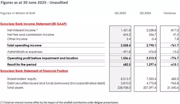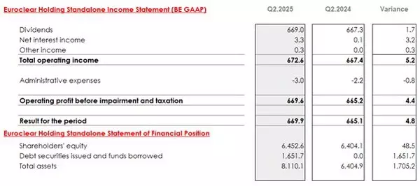 Euroclear Bank and Euroclear Holding are the two group issuing entities. The Q2 2025 summary income statements and financial positions for both entities are shown below.
