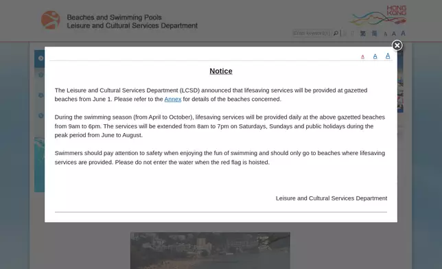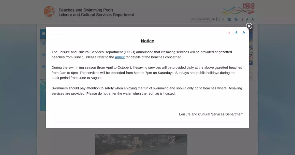 Note 1: Lifesaving services are provided by the Leisure and Cultural Services Department at 21 gazetted beaches, marked with an asterisk (*) above, from June 1. For details, please refer to the Leisure and Cultural Services Department's Special Announcement (www.lcsd.gov.hk/en/beach/index.html).
