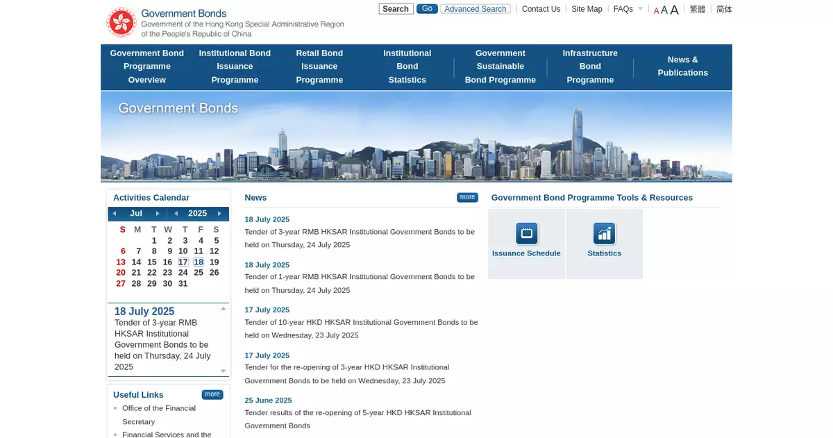 The Hong Kong Monetary Authority (HKMA), as representative of the Hong Kong Special Administrative Region Government (HKSAR Government), announced today (July 18) that a tender of 1-year RMB Institutional Government Bonds (Bonds) under the Infrastructure Bond Programme will be held on Thursday, July 24, 2025, for settlement on Monday, July 28, 2025.