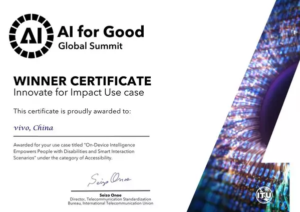 SHENZHEN, China, July 18, 2025 /PRNewswire/ -- vivo was honored with the "Innovate for Impact" best use case award in the accessibility category at the AI for Good Global Summit, in Geneva, Switzerland. Received on July 9, the award recognizes vivo's efforts in leveraging on-device artificial intelligence (AI) to empower accessibility with the initiative "On-Device Intelligence Empowers People with Disabilities and Smart Interaction Scenarios," which stood out among the top submissions from 32 countries. This recognition is a strong endorsement of vivo's long-standing commitment to inclusive technology and its leadership in advancing accessibility solutions globally.