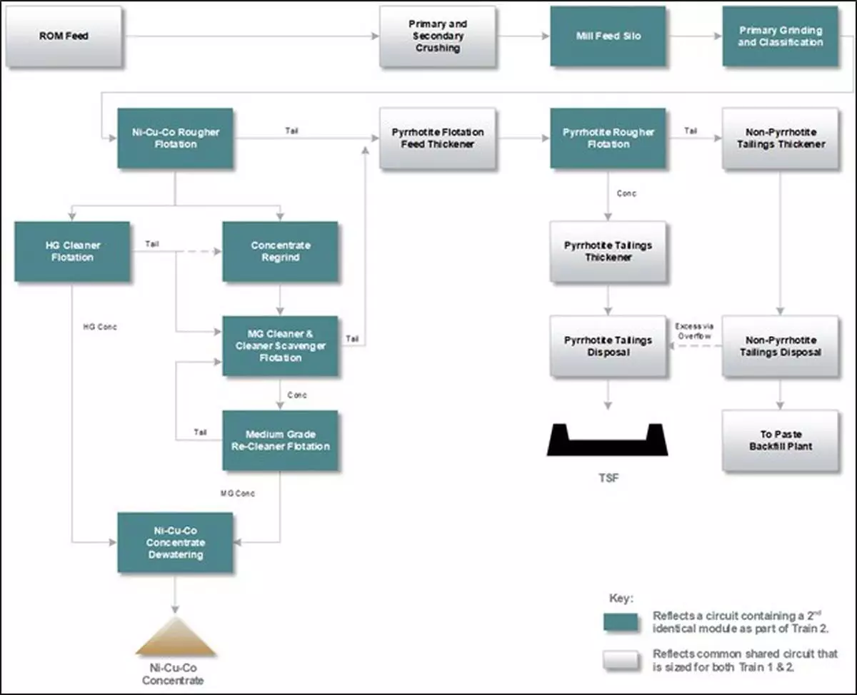 The flowsheet incorporates conventional crushing, grinding, and flotation circuits to recover nickel, copper, and cobalt sulfide minerals. The concentrator will produce approximately 350,000 tonnes (dry) per year nickel-copper-cobalt flotation concentrate containing 17.7% nickel, 2.6% copper, and 1.3% cobalt, with low levels of deleterious elements such as magnesium oxide (averaging 0.6% over the life of mine), at the steady-state 3.4 million tonnes per annum production rate.