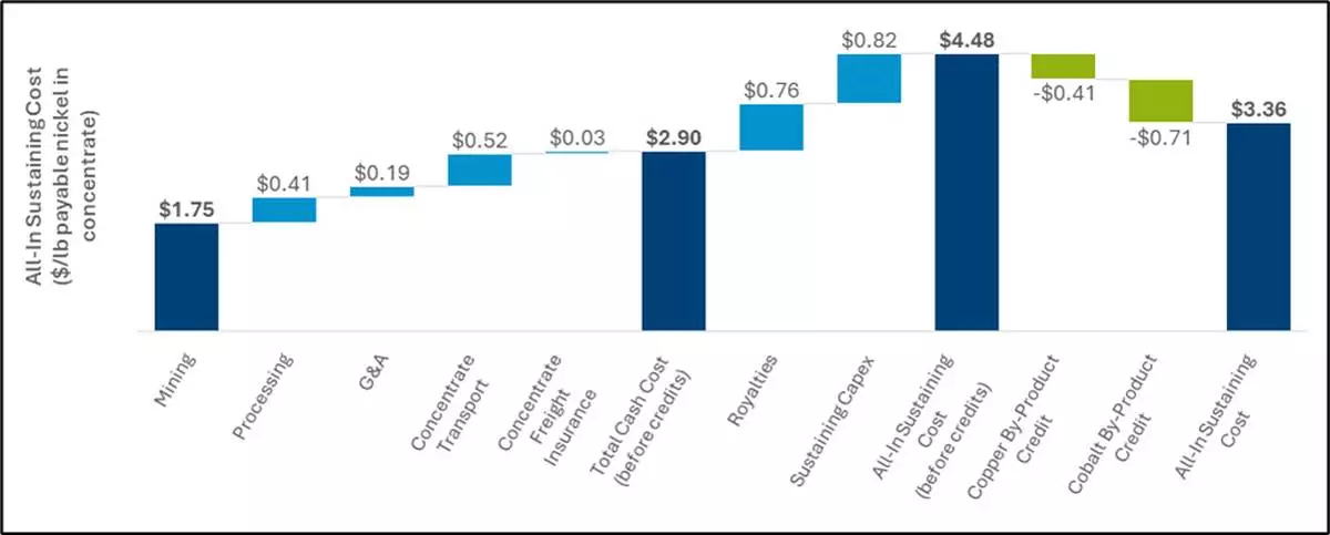 Total site operating costs are expected to average $70.10 per tonne milled, inclusive of mining, processing and general and administrative costs. On an all-in sustaining cost basis, Kabanga costs are estimated at $3.36 per pound of payable nickel in concentrate, net of copper and cobalt by-product credits.