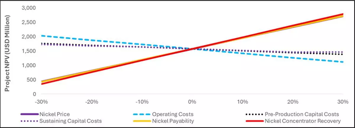Pre-production capital expenditures are estimated at $942 million, including 9.7% contingency, and covering underground mine development, concentrator construction, tailings storage facility and supporting infrastructure. The project demonstrates strong capital efficiency, with an initial capital intensity of approximately $18,800 per tonne per annum of nickel production – calculated by dividing pre-production capital expenditures by total life of mine contained nickel metal in intermediate product of 902,000 tonnes over 18 years.
