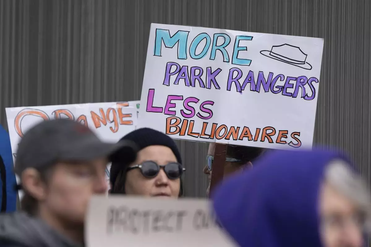 FILE - People hold signs during a protest outside the annual Alaska Sustainable Energy Conference, June 3, 2025, in Anchorage, Alaska. (AP Photo/Jenny Kane, File)