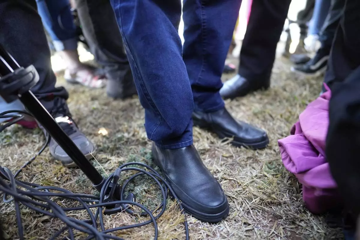 The feet of Brazil's former President Jair Bolsonaro are photographed as he stops to speak with the press while leaving the Secretariat of Penitentiary Administration after the Supreme Court ordered him to be fitted with an electronic ankle monitor in Brasilia, Brazil, Friday, July 18, 2025. (AP Photo/Eraldo Peres)