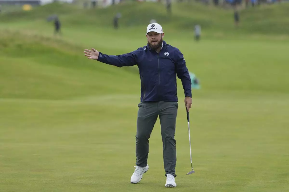 Tyrrell Hatton of England gestures after putting on the 10th green during the first round of the British Open golf championship at the Royal Portrush Golf Club, Northern Ireland, Thursday, July 17, 2025. (AP Photo/Jon Super)