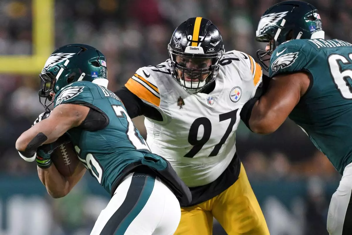 FILE - Pittsburgh Steelers defensive tackle Cameron Heyward (97) attempts to tackle Philadelphia Eagles running back Saquon Barkley (26) during the first half of an NFL football game, Sunday, Dec. 15, 2024, in Philadelphia. (AP Photo/Terrance Williams, File)